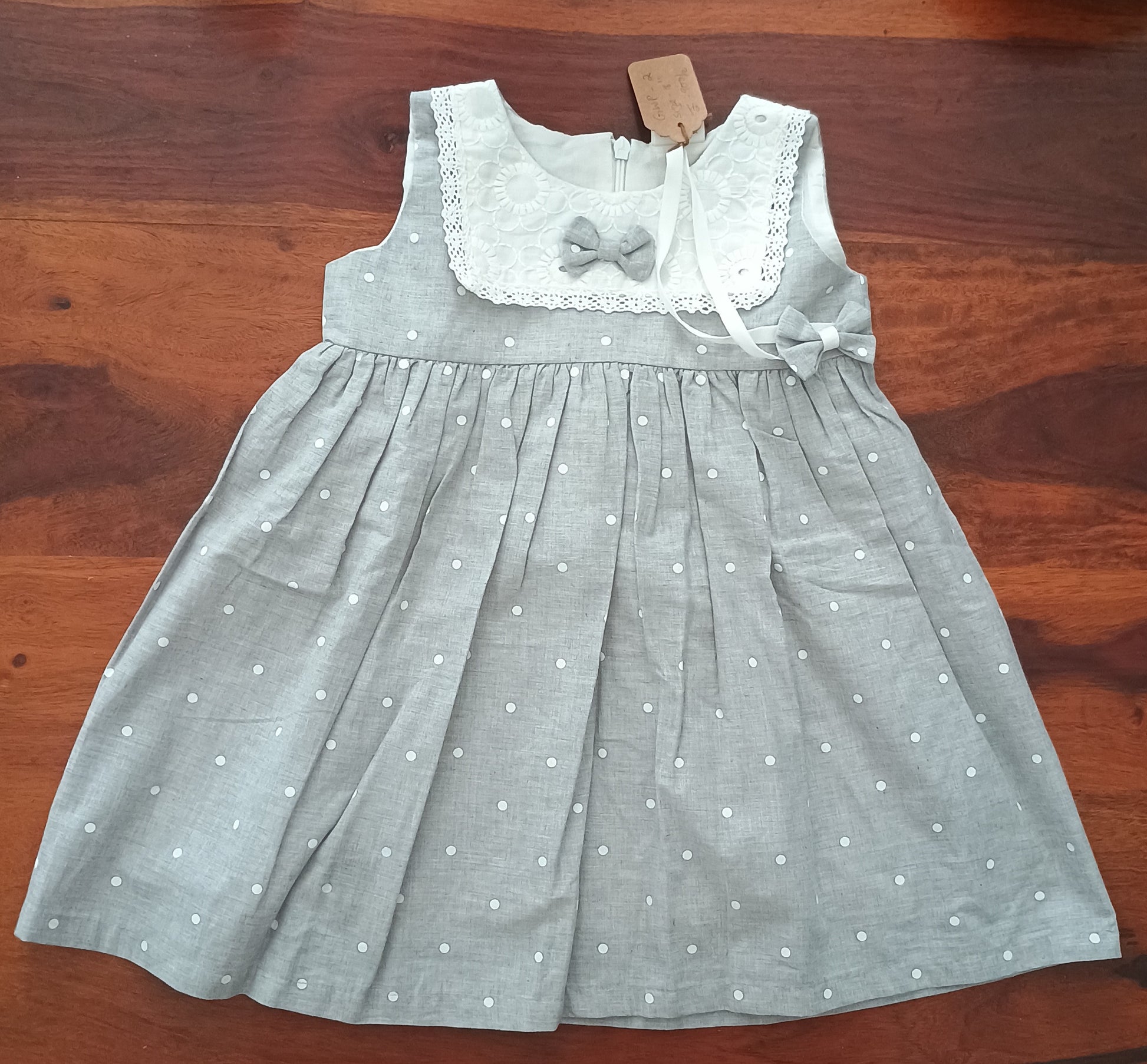 Dotted delight dress in classic grey with white polka dot pattern. The light grey background is sprinkled with crispy white dots creating a playful yet sophisticated look. It also adorns a beautiful self embroidered square collar in off white. A zipper at the back, high waist dress perfect for small occasion or just a casual visit.