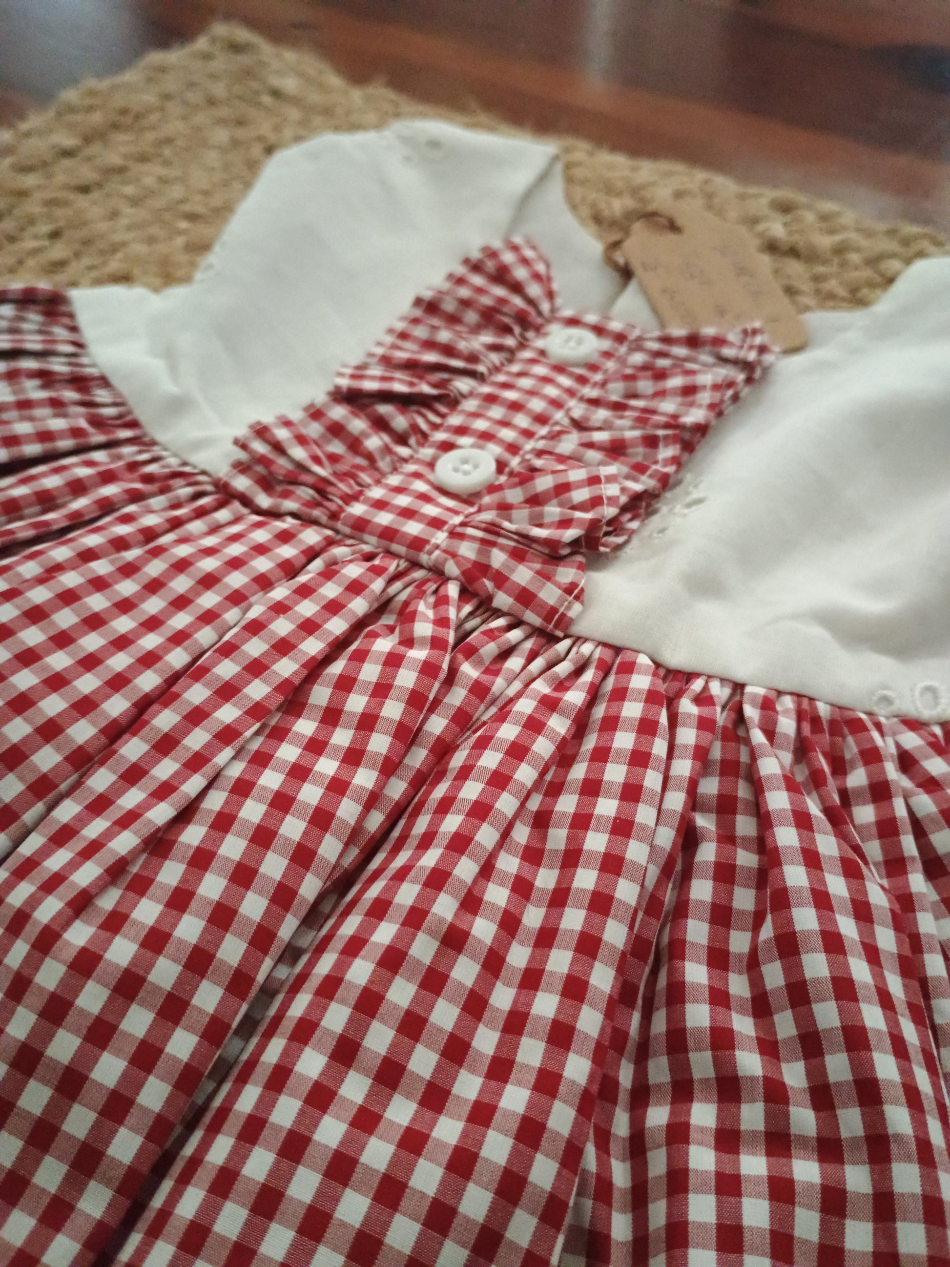 aA very simple typical English frock in white hakoba and gathers in red checks with red check frill along the centre of the bodice with white buttons. the dress is given an opening from behind all through the length of this cute dress. A summery dress in pure cotton for a comfortable daily wear.